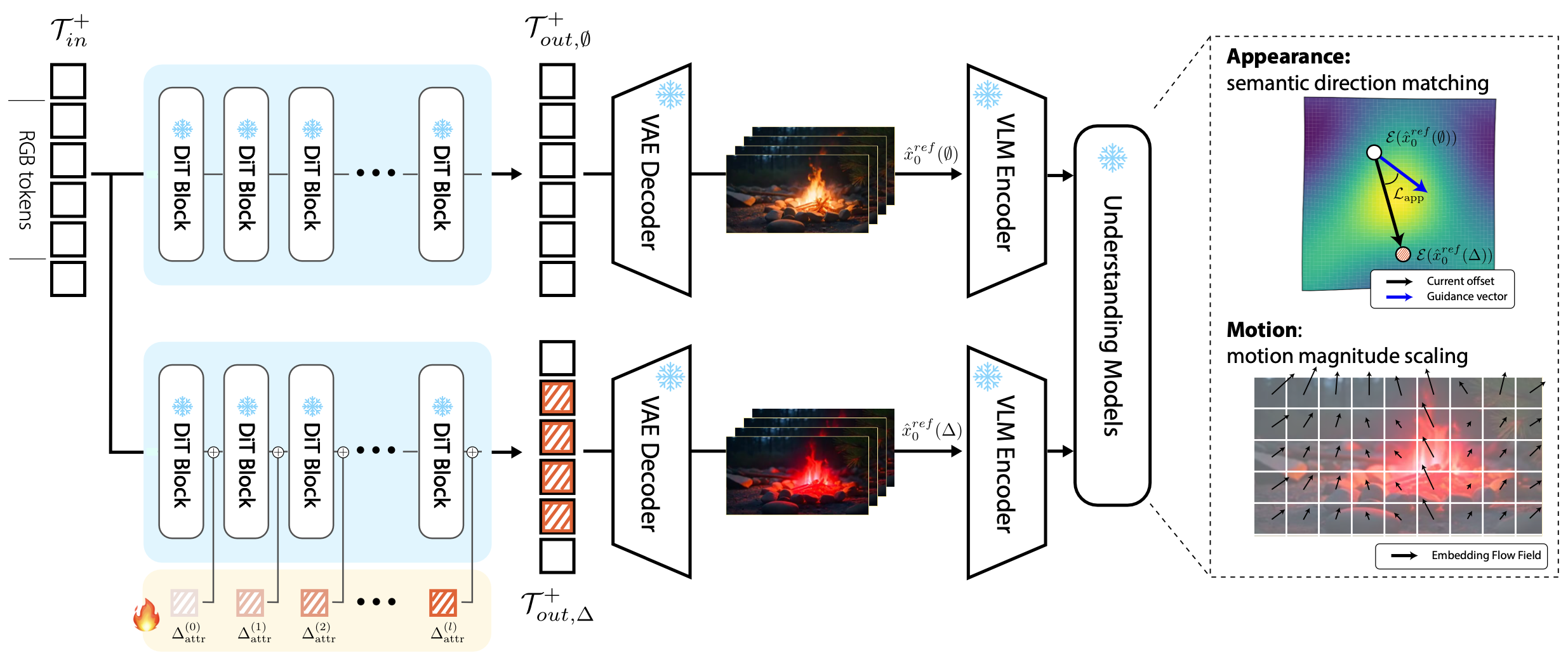For appearance sliders, we use semantic direction matching in visual embedding space to encourage the edited output toward the desired attribute direction.